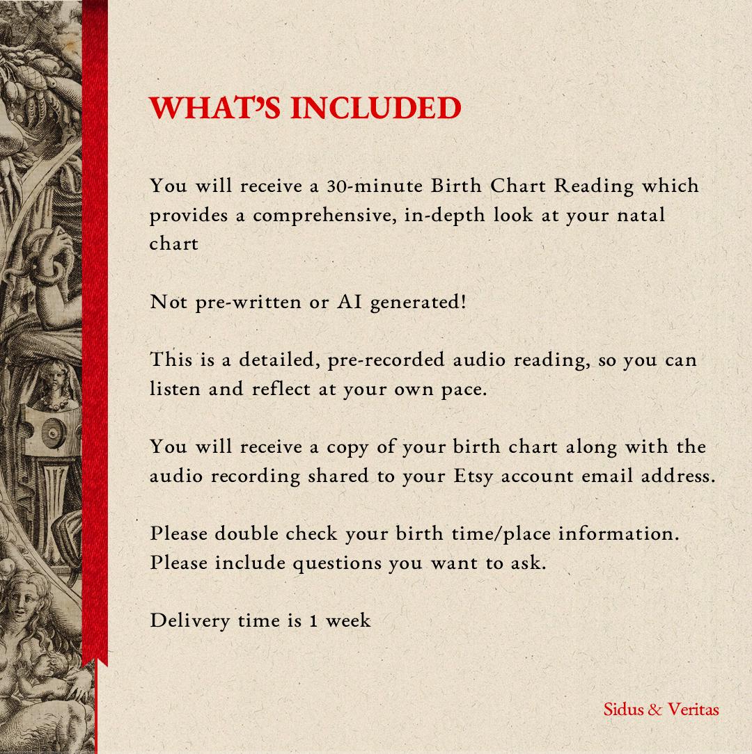 - A 30-minute pre-recorded audio reading analyzing your natal chart.